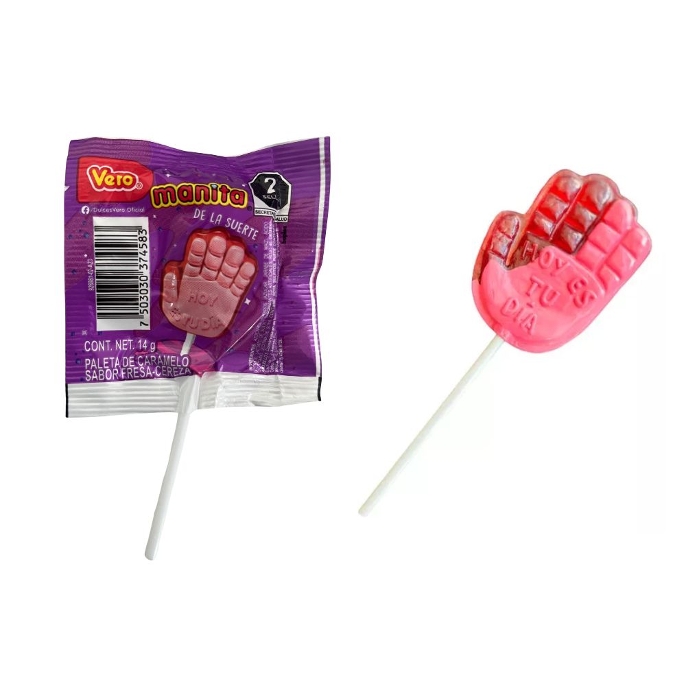 Manita della Fortuna! Lecca-lecca di caramello a forma di mano, gusto fragola e ciliegia, con un divertente messaggio all'interno!