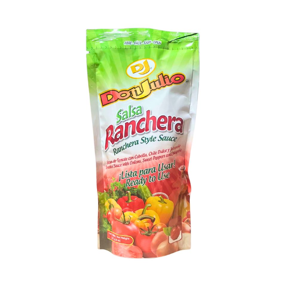 La Salsa Ranchera Don Julio è una salsa rossa densa e leggermente piccante, ideale per accompagnare carni, tacos, uova o tortillas. Preparata secondo la tradizione centroamericana, ha un sapore ricco, bilanciato tra pomodoro, cipolla, spezie e peperoncino.